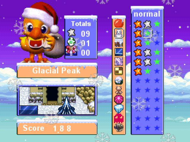 Weihnachtszeit, schöne Zeit! Was gibt es da besseres für unseren kleinen Chocobo als diese Zeit mit seinen Freunden Yoshi und Pogo zu verbringen? Doch wo sind die Freunde nur geblieben? Außerdem hat offenbar irgendwer wieder überall in der Gegend Edelsteine verstreut. Helft Chocobo dabei allen Gegnern auszuweichen und alle Edelsteine zu sammeln. Im späteren Verlauf des Spieles gesellen sich dann auch noch zwei weitere Charaktere dazu. Wer es schafft das Spiel in Leicht, Mittel und Schwer durchzuspielen, den erwartet noch ein weiterer, vierter Schwierigkeitsdrad. Fröhliche Weihnachten!